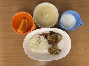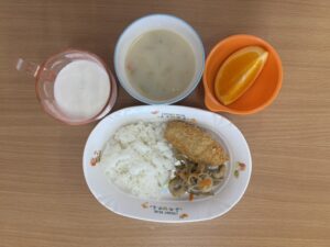 - 白身フライ / しゃきしゃき炒め / 豆乳スープ / オレンジ / パン(おやつ)