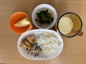 - 厚揚げと豚肉の味噌炒め煮 / マカロニサラダ / わかめのすまし汁 / りんご / かぼちゃケーキ(おやつ)