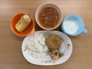 - メンチカツ / 彩和え / ミネストローネ / バナナ / パン(おやつ)
