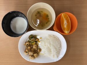 麻婆豆腐 / きゅうりの梅和え / もやしスープ / オレンジ / さつまいもマフィン(おやつ)