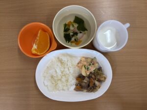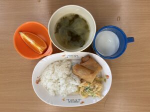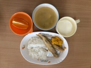 - ししゃもフライ / かぼちゃサラダ / 大根と厚揚げの味噌汁 / オレンジ / パン(おやつ)