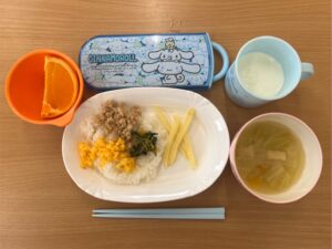- トマトとチーズのオムレツ / じゃがいものそぼろ煮 / 白菜スープ / オレンジ / パン(おやつ)