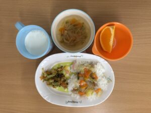 - 中華丼 / キャベツの昆布和え / もやしスープ / オレンジ / パルミエ(おやつ)
