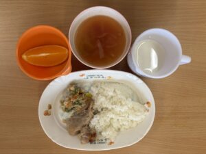 - 鶏肉の照り焼き / 大根ナムル / ミネストローネ / オレンジ / パン(おやつ)