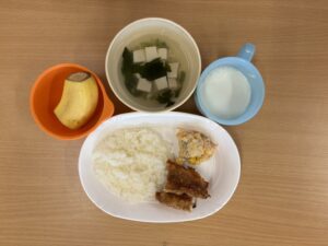 - 赤魚の唐揚げ / じゃがいもとツナのサラダ / ほうれん草のすまし汁 / バナナ / カルピスゼリー