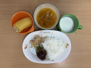 - れんこん入りハンバーグ / ブロッコリーとごぼうのツナマヨ和え / かぼちゃスープ / パンせんべい