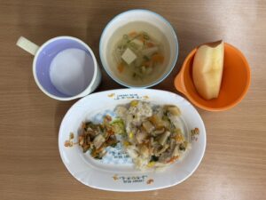 - あんかけチャーハン / きゅうりのうめ和え / えのきのすまし汁 / りんご / オニオンブレッド