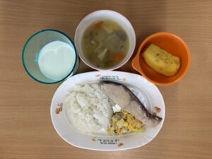 - 鮭の塩焼き / さつまいものサラダ / 豚汁 / バナナ / ポンデケージョ