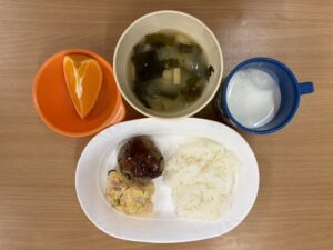 - ひじきハンバーグ / ポテトサラダ / わかめ味噌汁 / オレンジ / ほうれん草蒸しパン